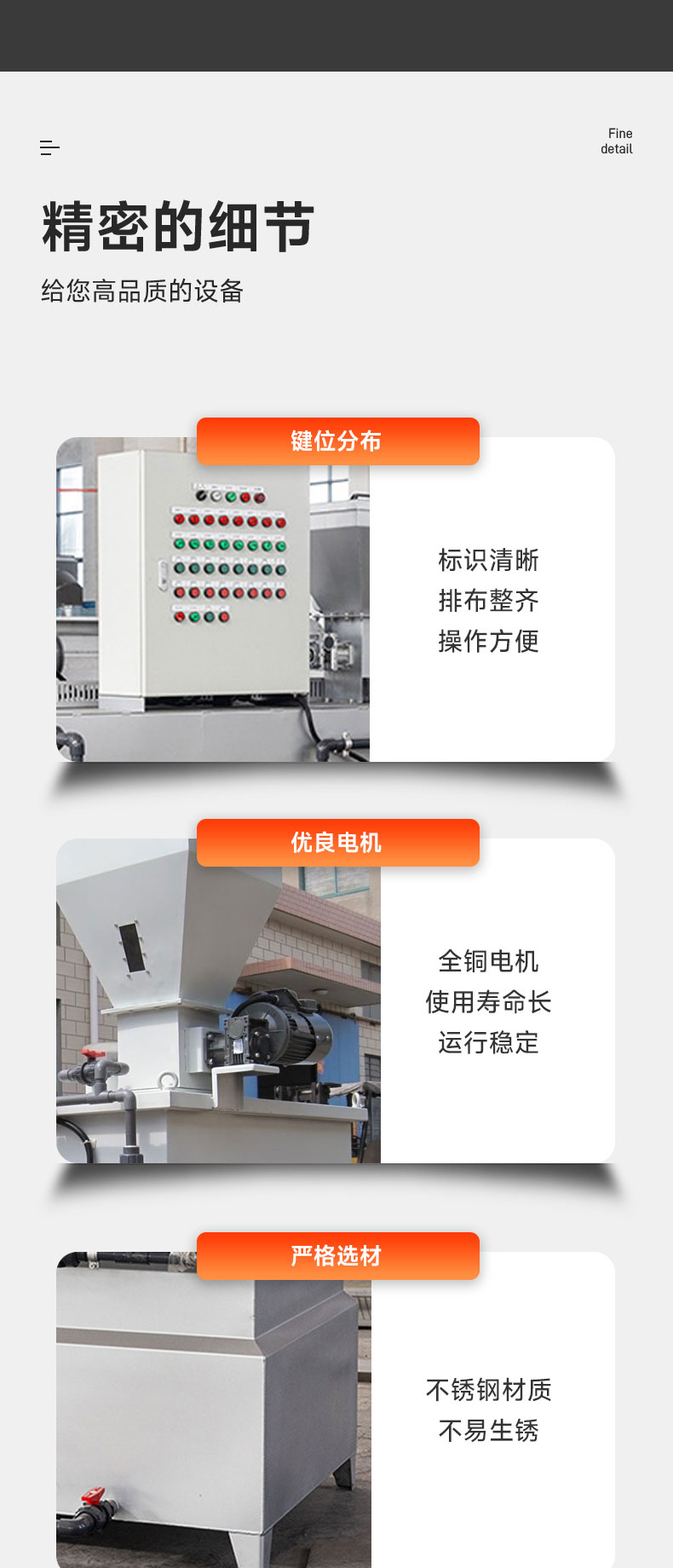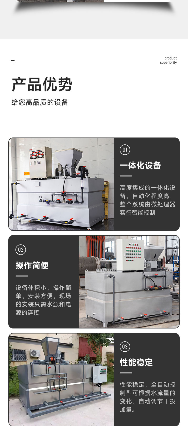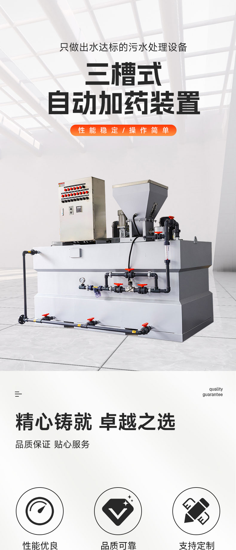 • 一、三槽式自動溶藥裝置的簡介三槽式自動溶藥裝置連續(xù)調(diào)配聚合物溶液的自動化設(shè)備機器。主要由三腔藥箱、自動吸料機、自動溶粉機、自動配水系統(tǒng)、出藥系統(tǒng)、就地電氣控制系統(tǒng)等組成。加藥螺旋采用變頻調(diào)速可滿足固體和液體絮凝劑的自動制備。中泰-三槽式自動溶藥裝置圖片二、三槽式自動溶藥裝置的工